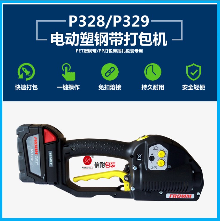 P328打包機(jī)是FROMM公司新推出的新型電動打包工具。在原P326打包機(jī)的基礎(chǔ)上,采用新加強(qiáng)型18V馬達(dá),并導(dǎo)入鋰電池,使其性能更加完美。采用電池提供動力,可滿足大范圍工作區(qū)域的工作需要??梢詰?yīng)用于輕型和重型的塑鋼帶包裝。訂購熱線:021-5488-4151