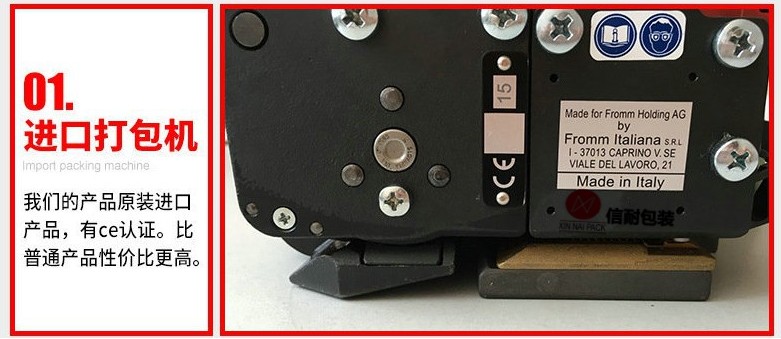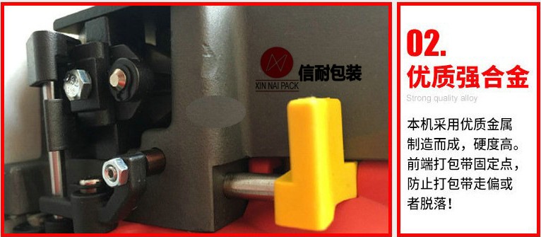 操作方法: 將塑鋼帶或塑料打包帶,從上往下纏繞捆包物體一圈后,將打包帶接頭處放入機器工作槽內(nèi),由電機帶動束緊輪,將打包帶束緊,通過摩擦作扣的方式將帶粘接,最后自動進行切帶。
