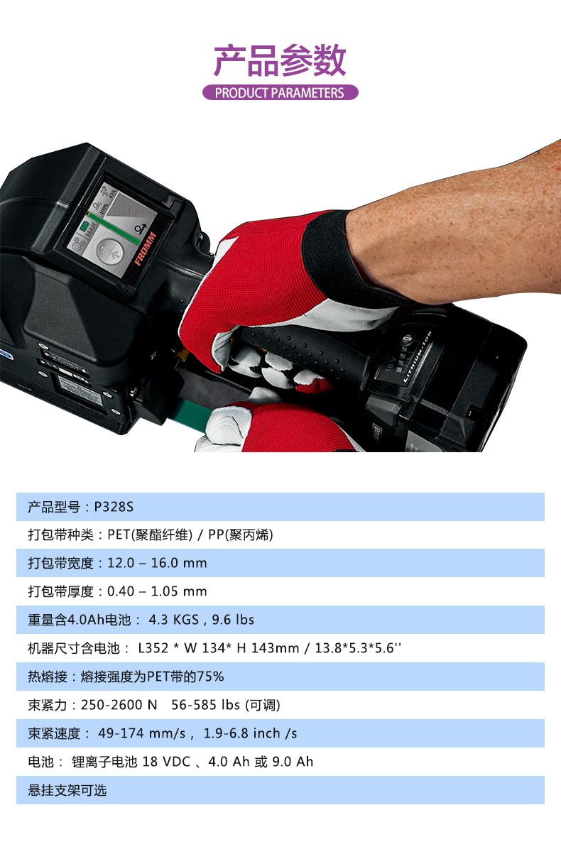 P328S手提電動打包機PET塑鋼帶全自動捆扎機 捆包尺寸:寬度10.0 - 16.0毫米/3/8 - 5/8“ 厚度0.40 - 1.05毫米/0.016 - 0.041“ 重量含.電池:4.2千克/9.3磅 刀具尺寸與電池:L351 x W134 x H143 mm / 13.8” x 5.3” x 5.6” 密封類型:摩擦熔接密封 平均密封強度:約.75%(取決于打包帶質(zhì)量) 拉力:250 - 2600 N /56 - 585磅(可調(diào)) 拉伸速度:67 - 124毫米/ S/2.6 - 4.9英寸/秒 電源:電池鋰離子18VDC/4.0Ah 懸掛支架:自選 |產(chǎn)品優(yōu)勢 高張力高達2600N/585磅 張力和密封時間可調(diào)旋鈕簡單 版本可在這兩個半自動和全自動(單按鈕)工具 為有效的操作 更少的維護和提高續(xù)航時間無刷電機 改進板和導(dǎo)軌 - 較少的努力,從帶移除工具 無張力搖桿 - 更容易從小型封裝表面去除工具 電機溫度監(jiān)控,保護電機過熱 循環(huán)計數(shù)器包括(需要專門的閱讀器) 電池很好的保護 包括電池充電指示燈 簡單的單手操作 工具是全覆蓋的保護手指 可降低風(fēng)險的過熱電機選配散熱風(fēng)扇 |