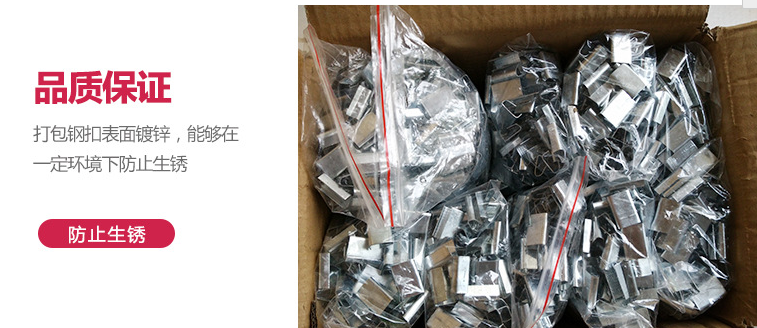 4、最后持剪刀將打包帶剪斷。塑鋼打包扣各種規(guī)格型號(hào)的pet塑鋼打包扣,扣子表面經(jīng)鍍鋅處理,內(nèi)部齒高、密,拉力可達(dá)400公斤以上,打包后不易脫落。主要規(guī)格有0.6*16mm、0.8*16mm、0.8*19mm、1.0*19mm.被廣泛用于:物流,電子,木業(yè)等各大行業(yè)。是出口產(chǎn)品當(dāng)中首. 特性:本產(chǎn)品通過(guò)PP高強(qiáng)度打包帶結(jié)合打包扣根據(jù)物理原理達(dá)到緊固包裝的目的,可承受80公斤以上拉力強(qiáng)度,具有強(qiáng)度高、韌性好、質(zhì)量穩(wěn)定、綠色環(huán)保的特點(diǎn)。打包扣替代傳統(tǒng)的尼龍繩及手工打包帶包裝方式,可在不持任何工具情況下進(jìn)行包裝使用,操作簡(jiǎn)單、攜帶方便,并可重復(fù)使用,是各類包裝耗材、辦公用品及外出旅游的首選產(chǎn)品。 本產(chǎn)品通過(guò)PP高強(qiáng)度打包帶結(jié)合打包扣根據(jù)物理原理達(dá)到緊固包裝的目的,可承受40公斤以上拉力強(qiáng)度,具有強(qiáng)度高、韌性好、質(zhì)量穩(wěn)定、綠色環(huán)保的特點(diǎn) 鐵皮打包扣選用寶鋼專用帶鋼,內(nèi)有密麻小刺,起到防滑、增加聯(lián)系處拉力、保障貨物安全的效果。打包鐵扣表面鍍鋅,能夠防止生銹。規(guī)格在寬度13-19mm,厚度0.6-1.0mm之間,可根據(jù)打包帶規(guī)格進(jìn)行配套使用。鐵皮打包扣必須用專用的打包機(jī)打包。供應(yīng)打包扣為:PP帶專用鐵扣、PET打包帶專用扣、塑料打包扣(環(huán)保型)