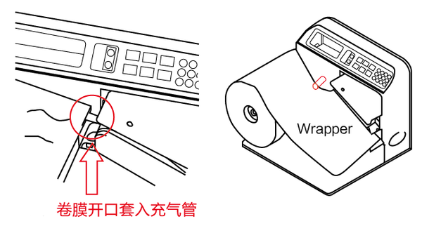 2)把卷膜的進(jìn)氣孔穿入設(shè)備的充氣孔,將膜拉入到進(jìn)膜槽。進(jìn)氣孔直接穿過(guò)設(shè)備的充氣金屬孔即可。